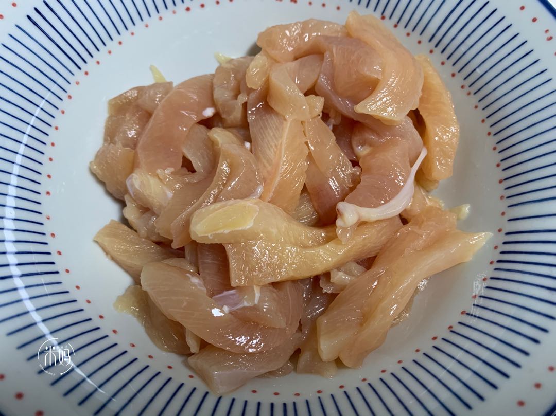1、鸡胸肉切条,加入葱姜,白胡椒粉适量,料酒1勺,盐少许,鸡蛋1个抓匀。