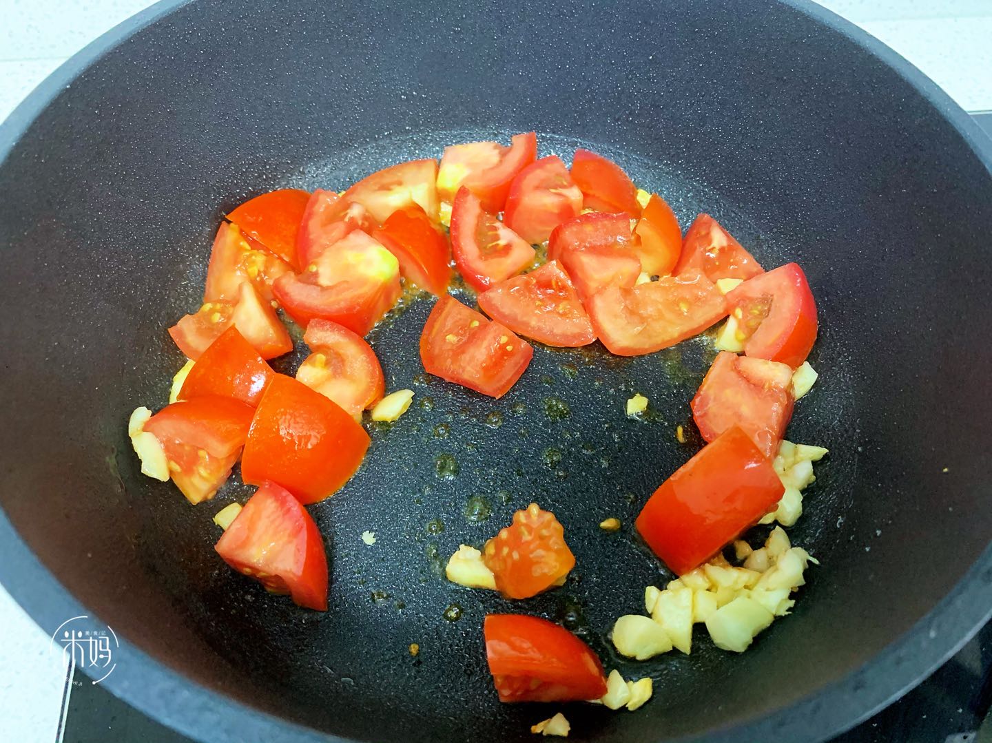 3、锅中放油,放蒜末爆香,再加入番茄,把番茄炒软炒出汁。