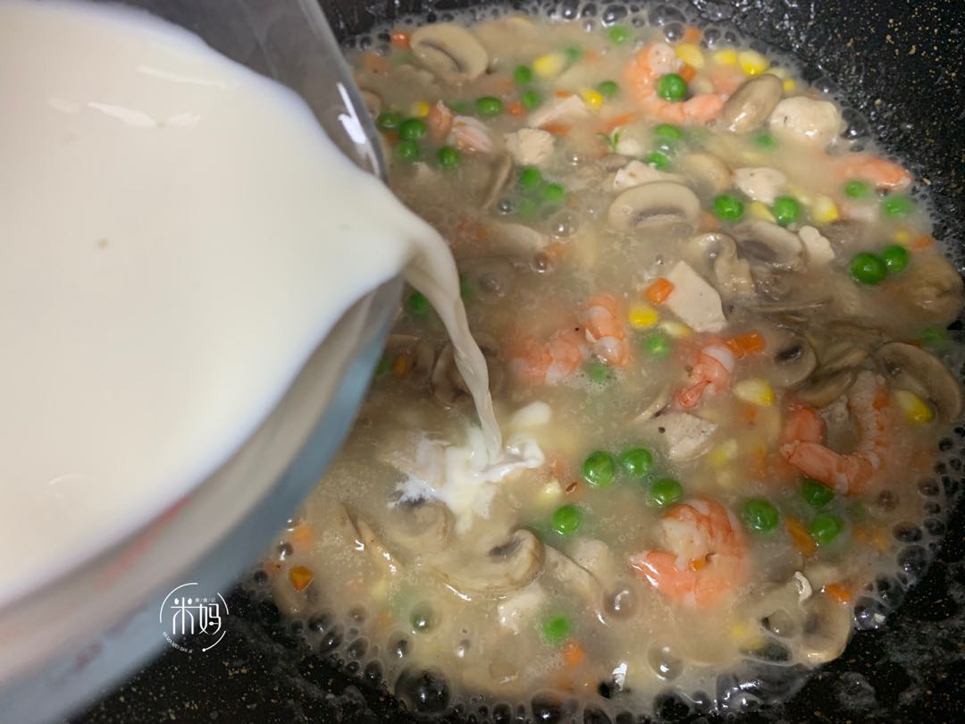9、 加入一盒牛奶煮至汤汁浓稠。