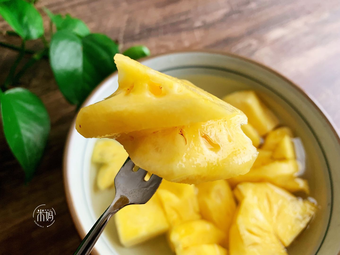 小贴士:菠萝本身的蛋白酶、苷类成分会分解蛋白质,这样容易刺激人体的嘴唇和口腔面膜表皮层,有的人容易对这个过敏,我们在食用菠萝前,菠萝切块,凉白开加入食用盐,浸泡20-30分钟再食用,浸泡过后的菠萝更口感更甜更爽口。