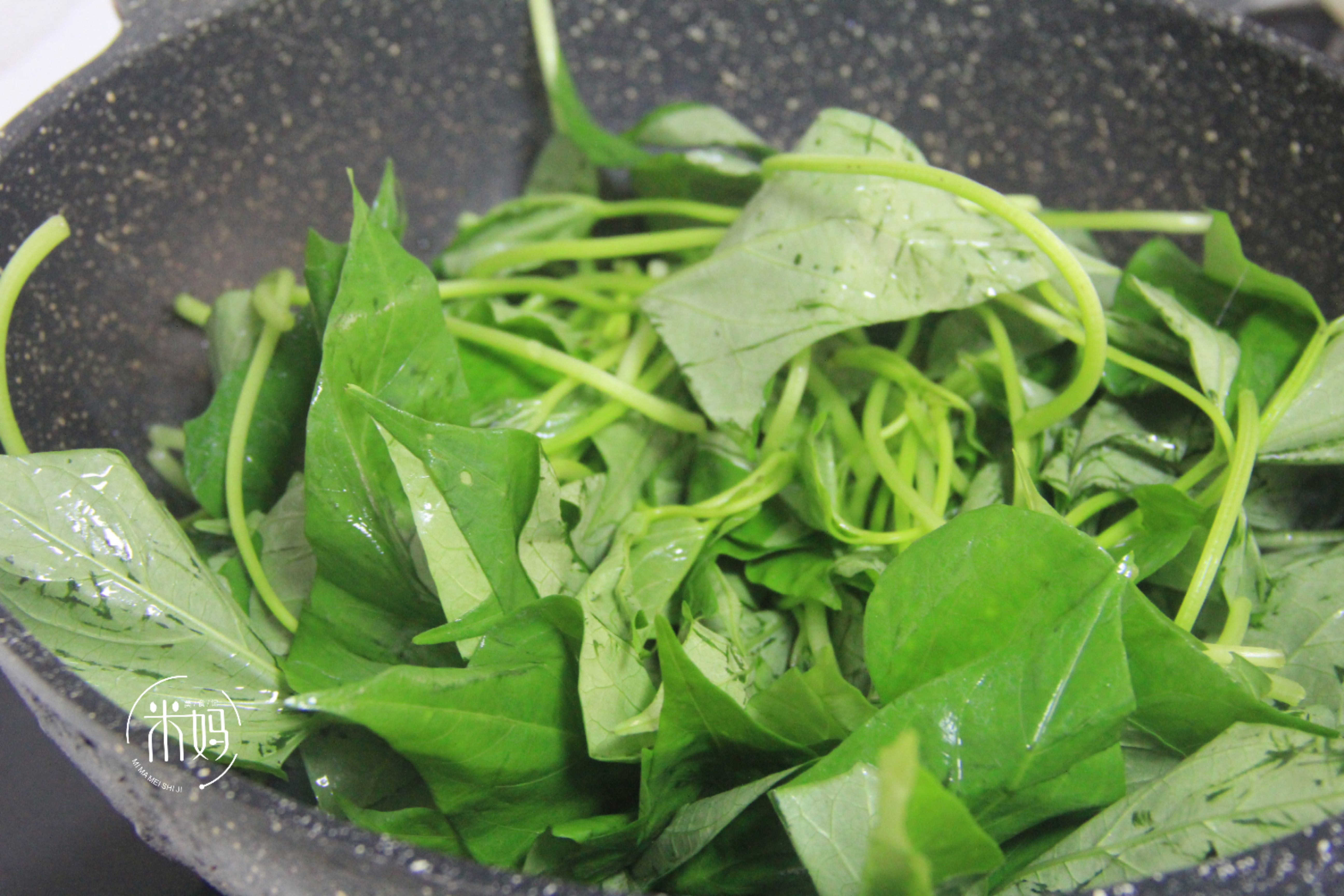 5、接着放入红薯叶,大火快速翻炒,炒至红薯叶变软。