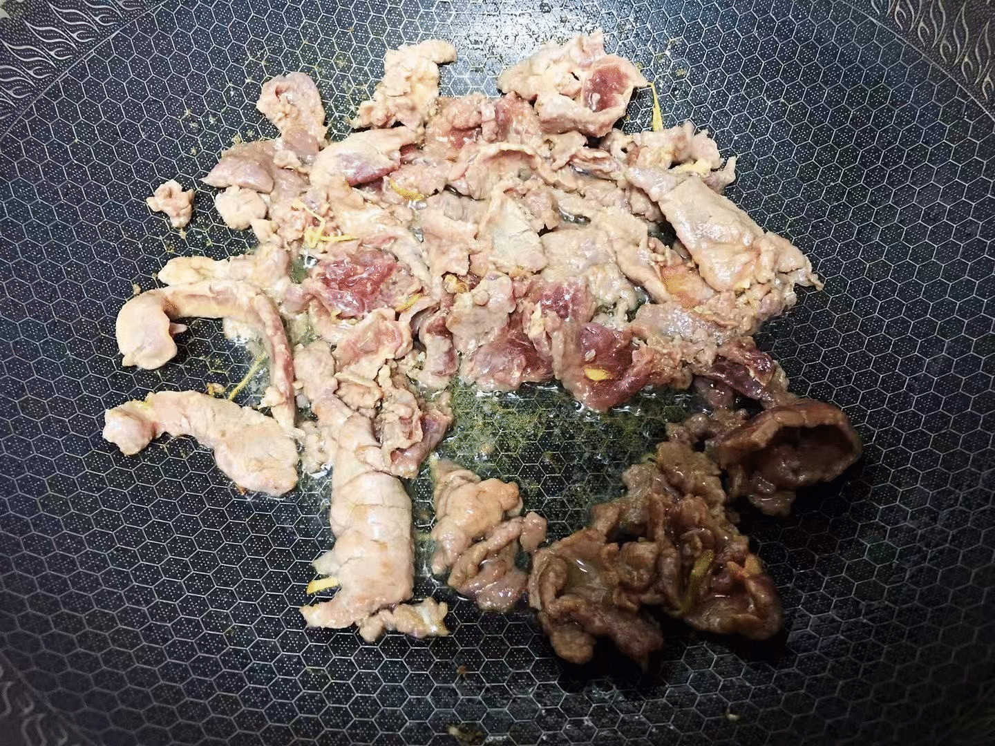 2、 锅中加入油,加入牛肉,炒8成熟后盛出备用。