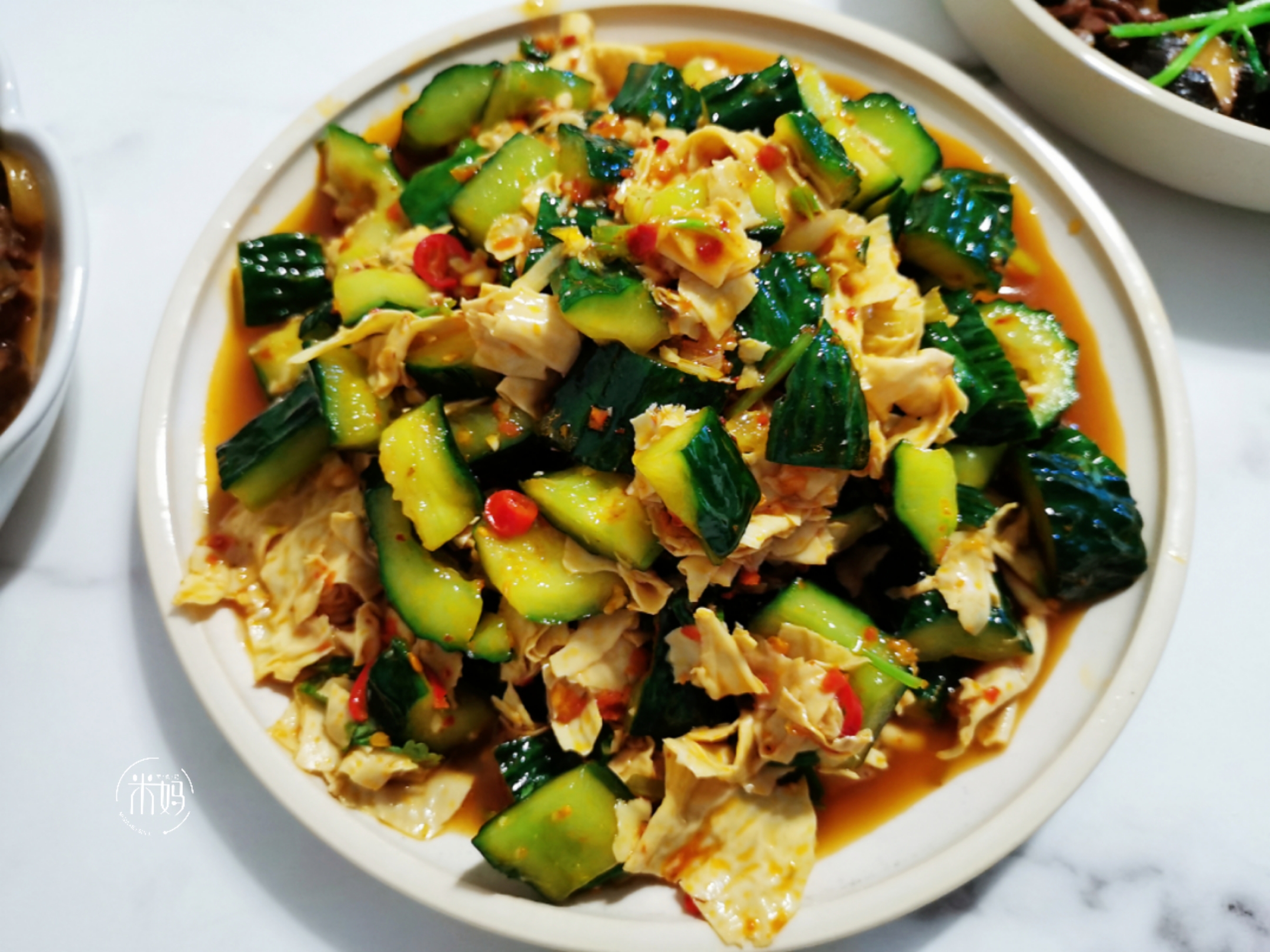 很开胃的一道凉拌菜,腐竹焯水煮熟,黄瓜拍碎,加入辣椒面,蒜蓉,淋上热油,再加入生抽,香醋,香菜,白糖,香油拌匀即可。