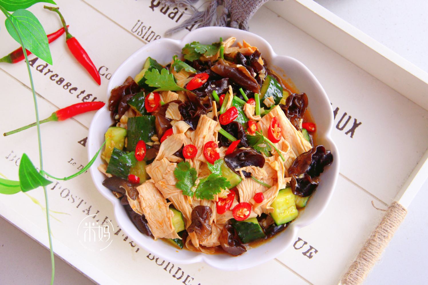 食材:腐竹,木耳,黄瓜,香菜,大蒜,小米椒