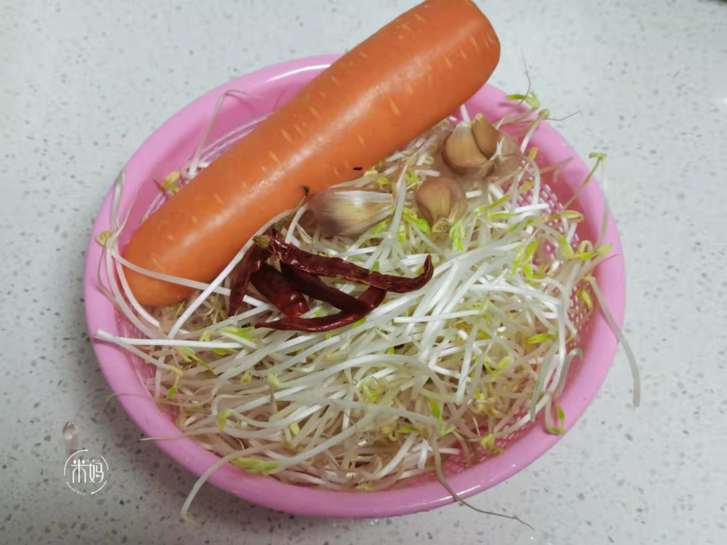 第一步:首先绿豆芽清洗干净,控干水备用。胡萝卜去皮切丝,蒜米切末,干辣椒切小段备用。