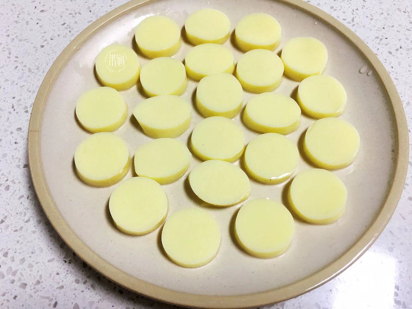 3、豆腐切成薄片,摆放盘子底部。不喜欢吃玉子豆腐可以换成山药或者是其他食材。