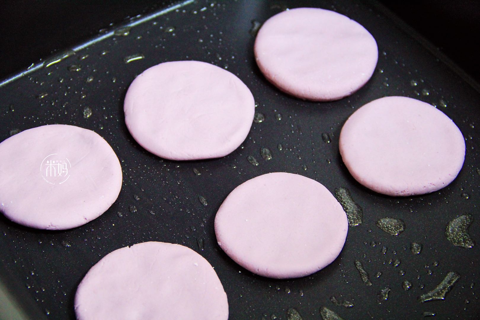 6、平底锅刷上一层油,放上搓好的丸子,用手心按压成饼状。