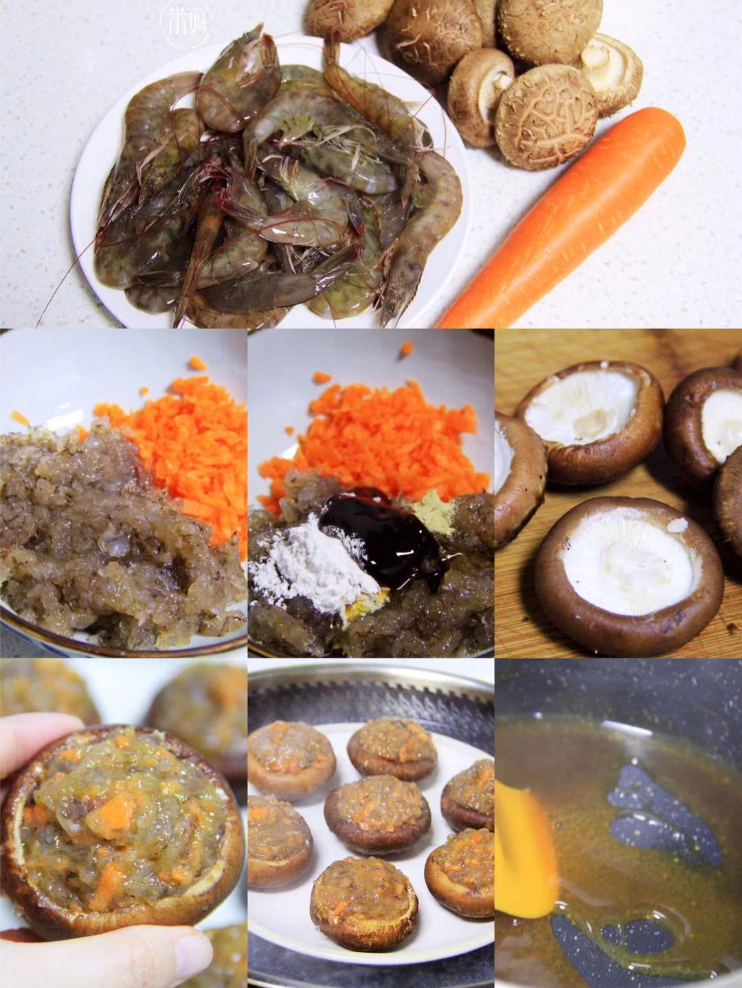食材:鲜虾200克,香菇9朵,胡萝卜20克,盐 少许,料酒1勺,胡椒粉半勺,生抽2勺,蚝油1勺,淀粉1勺