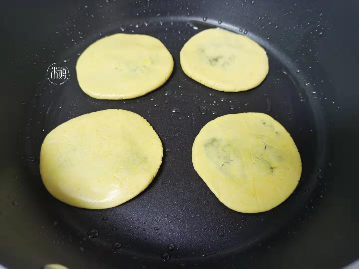 10、平底锅刷上一层油,放上搓好的丸子,用手心按压成饼状。