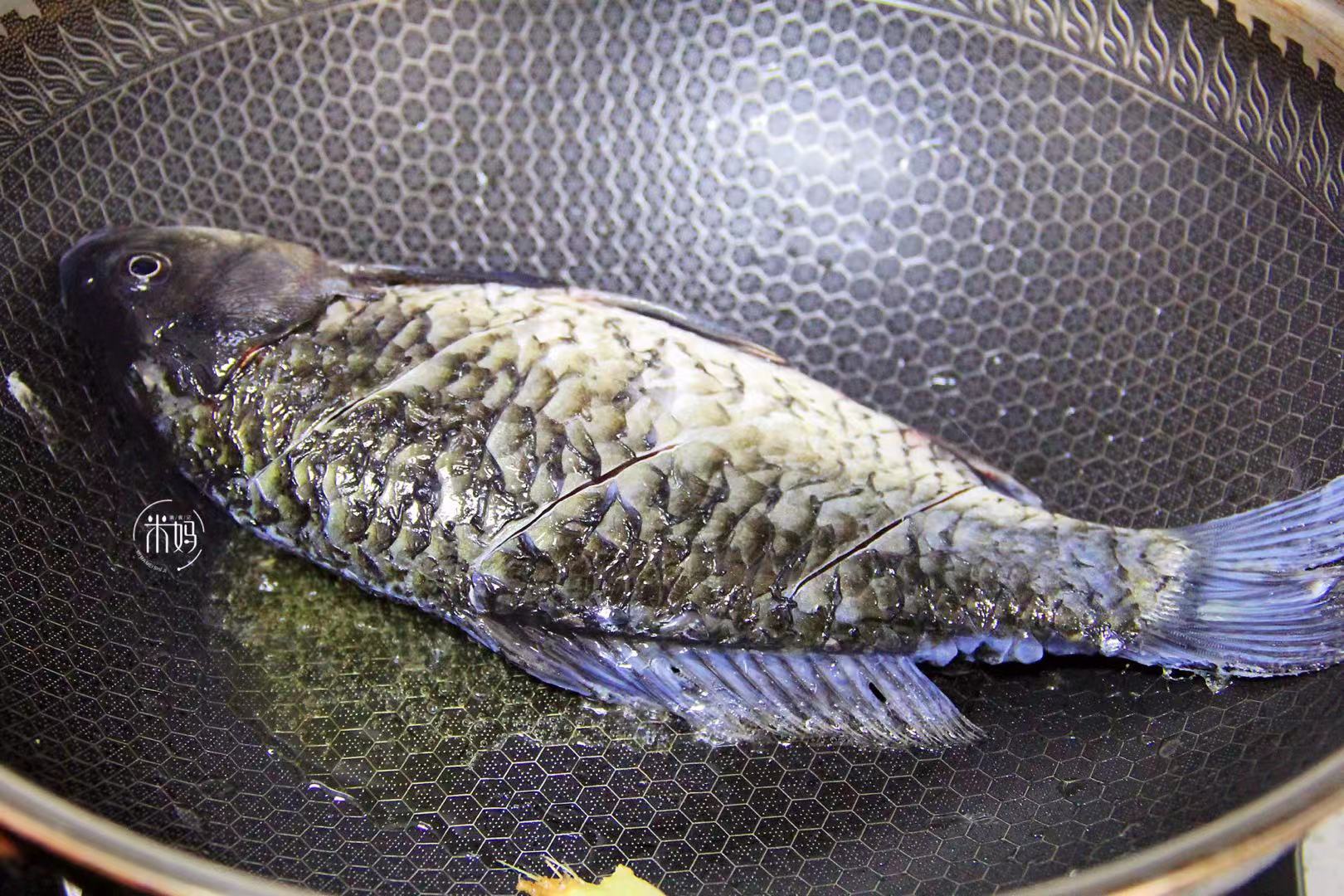 5、 把鲫鱼煎至两面金黄。