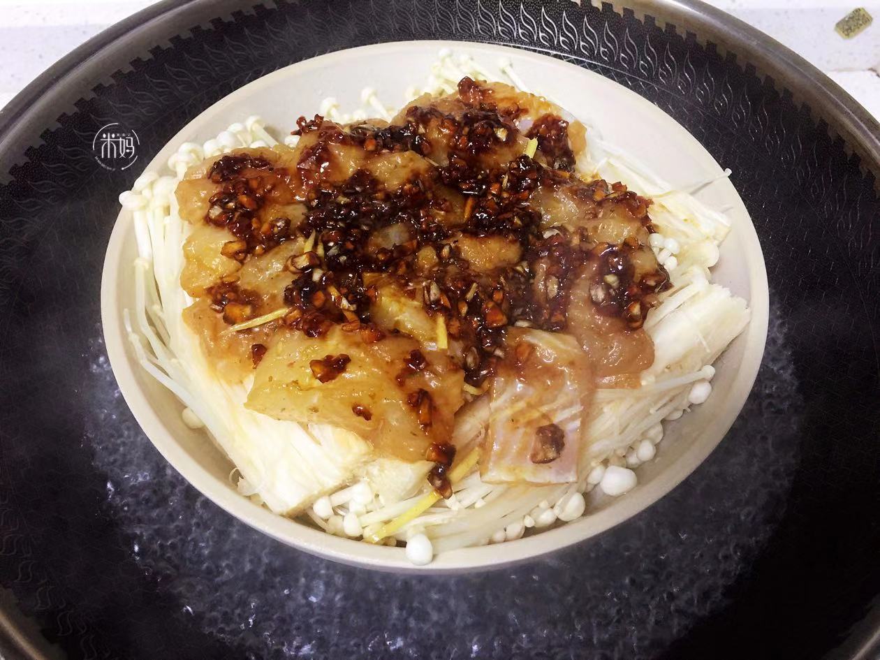 3、加入腌制好的巴沙鱼,平铺在金针菇的上面。