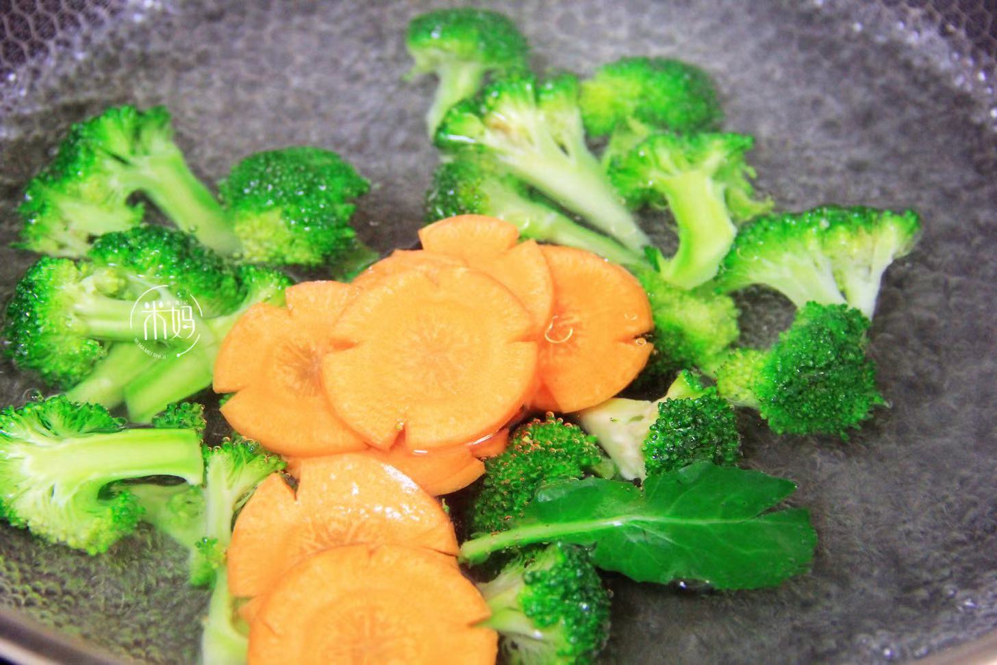 4、锅中加入清水,大火煮开,加入一勺油一勺盐,加入胡萝卜和西蓝花,煮熟后捞出沥干水备用。