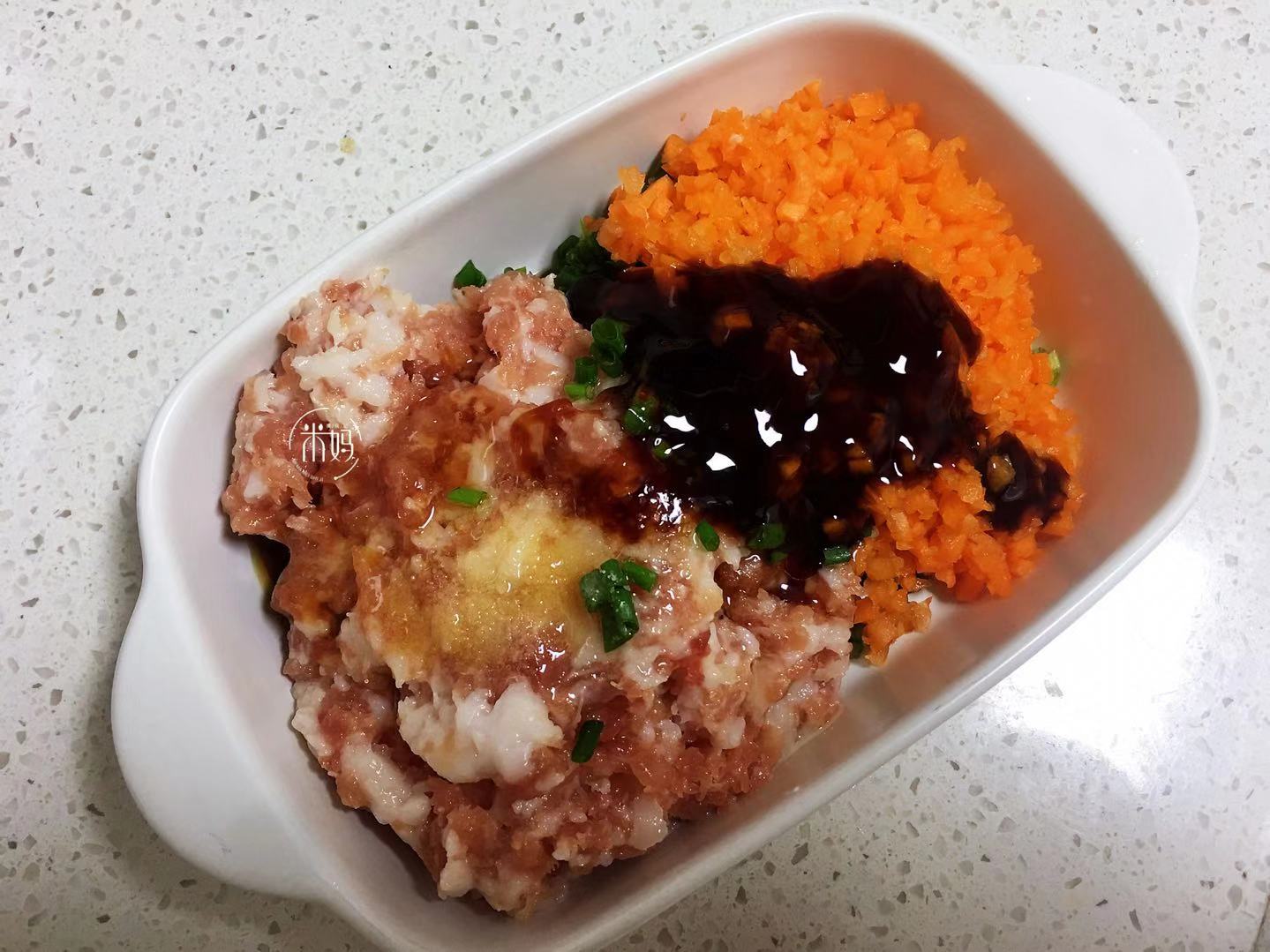 1、把猪肉洗净都剁碎,胡萝卜洗净,无需去皮再剁碎,小葱切末,放入碗中。
