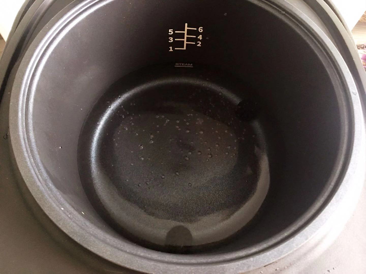 4、今天我用的巧釜电饭煲来做这道菜,电饭煲里面有一个三角釜内胆和一个蒸米饭用的甑子。三角釜内胆里面放入最低水位的清水。