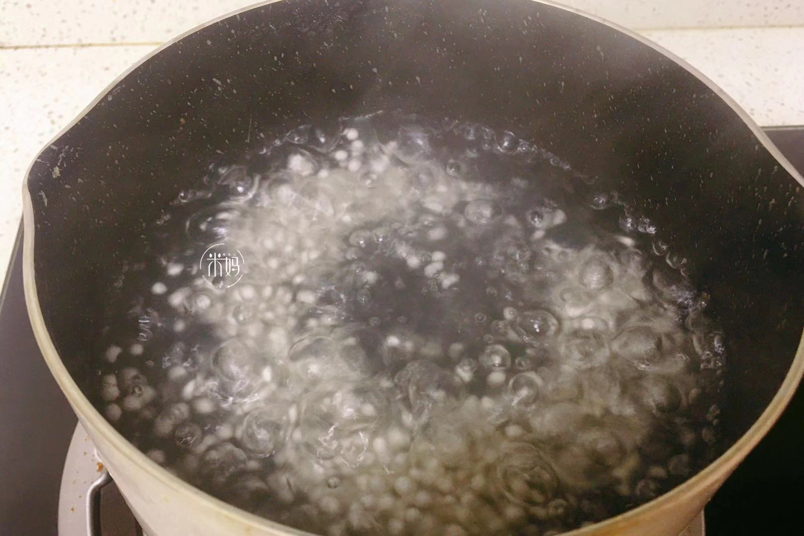 7、锅中再次注入清水,煮开,加入西米,持续滚开煮5分钟,关火盖上盖子焖8分钟,可以看到最外面的一圈已经变成透明,这时候再把水倒掉,接新的凉水,继续煮开后煮5分钟,关火再焖15分钟左右,再打开盖子的时候,就会发现西米都变透明了。再过几遍凉水即可。