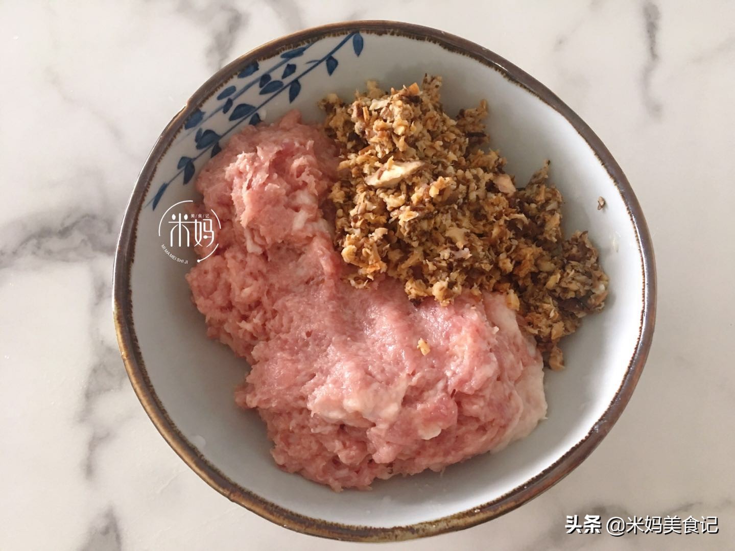 步骤一:选择半肥瘦的猪肉,把它剁成肉末,香菇提前泡软,也剁碎,装入碗中。