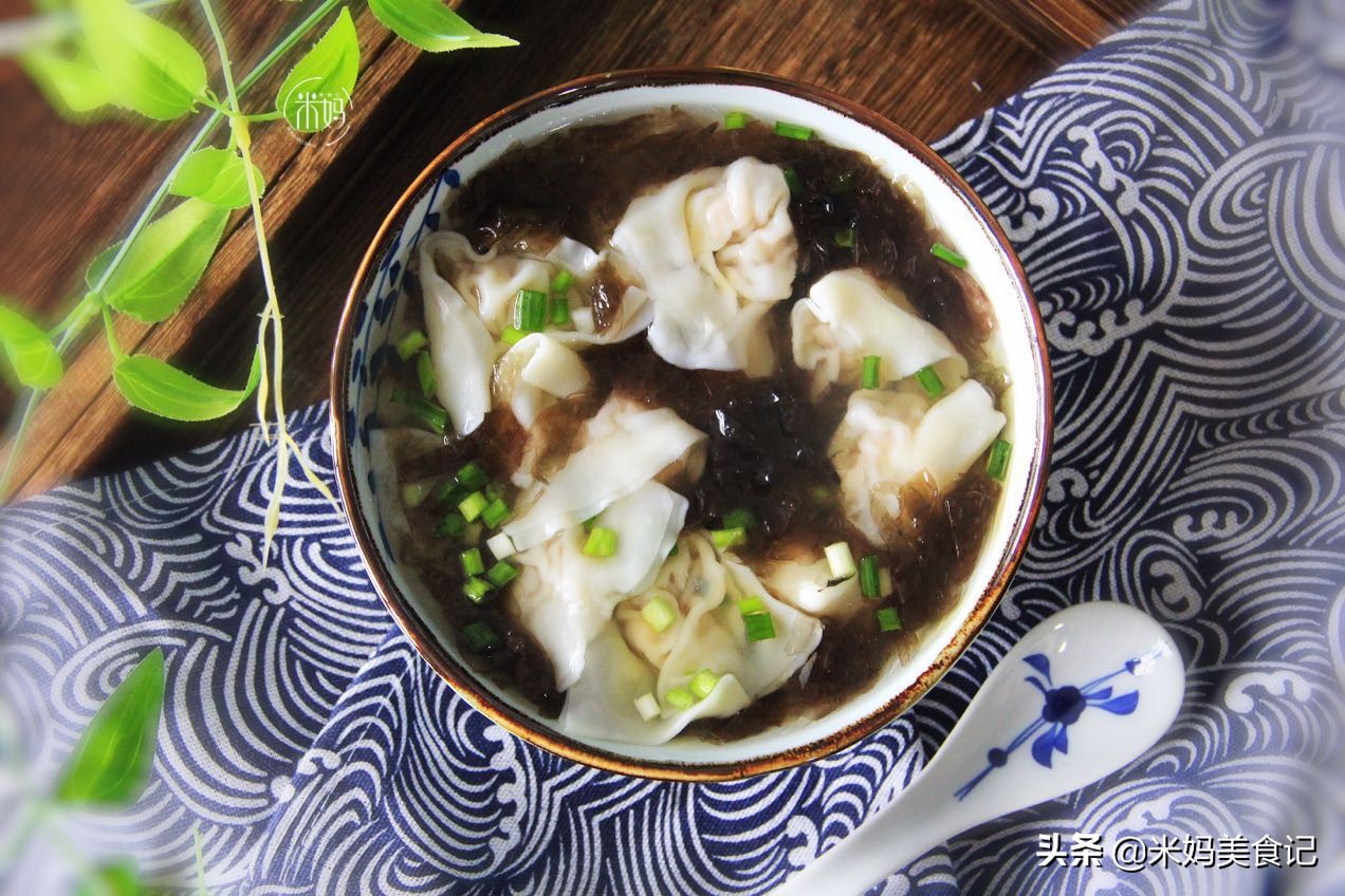 步骤七:最后加入把煮好的云吞,捞起来,放入紫菜汤的碗中,加入少许葱末,还有少许胡椒粉,几滴香油,拌匀就可以开吃啦!先喝汤,再吃肉!紫菜汤喝起来十分香浓,云吞吃起来清爽又弹牙,真是美味极了!家里有虾米,放点虾米更棒哟!