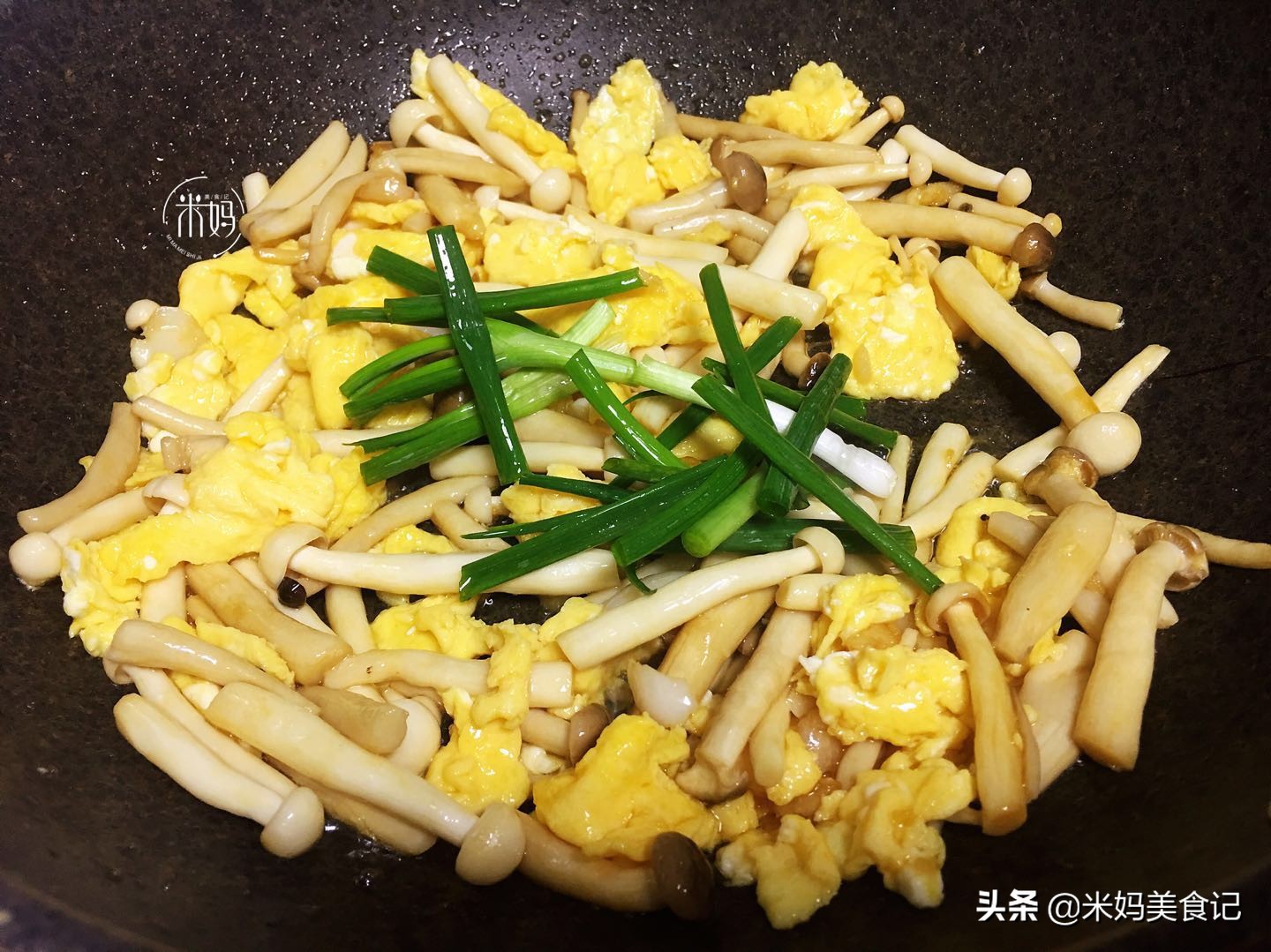 食材:蟹味菇,海鲜菇,鸡蛋,小葱,大蒜,生抽,蚝油,鸡精,盐