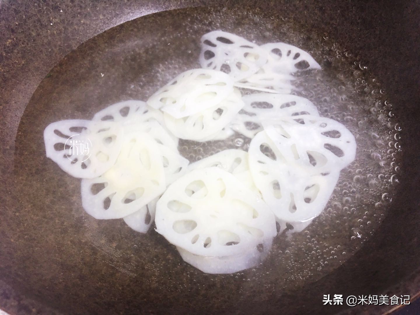 步骤二:3分之一的莲藕切成薄片,锅中注入清水,大火煮开,加入一小勺白醋,搅匀,再加入莲藕,焯水1分钟,让莲藕变软。放白醋可以使莲藕不被氧化变黑。