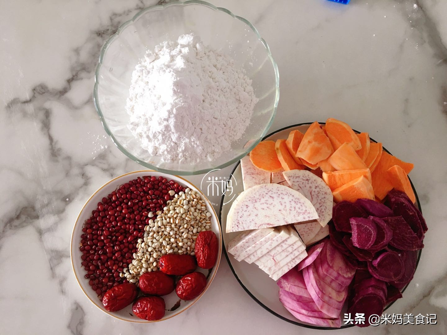 步骤一:把所有的食材都准备好后,就是把红薯,紫薯,芋头都切片,冷水上锅蒸熟。
