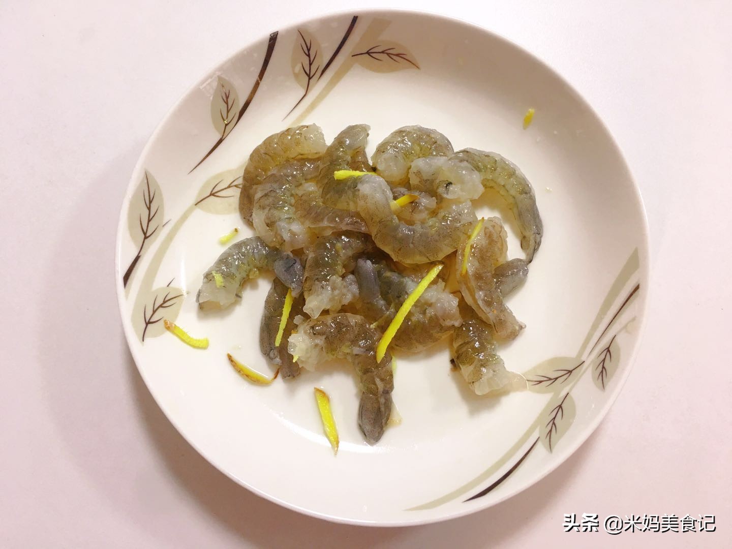 步骤一:虾挑去虾线,去虾壳,装碗中,放一勺料酒加一小撮盐,一小勺淀粉,加姜丝,用手抓匀腌制5-10分钟去腥。放淀粉,可增加虾仁Q弹脆嫩的口感。