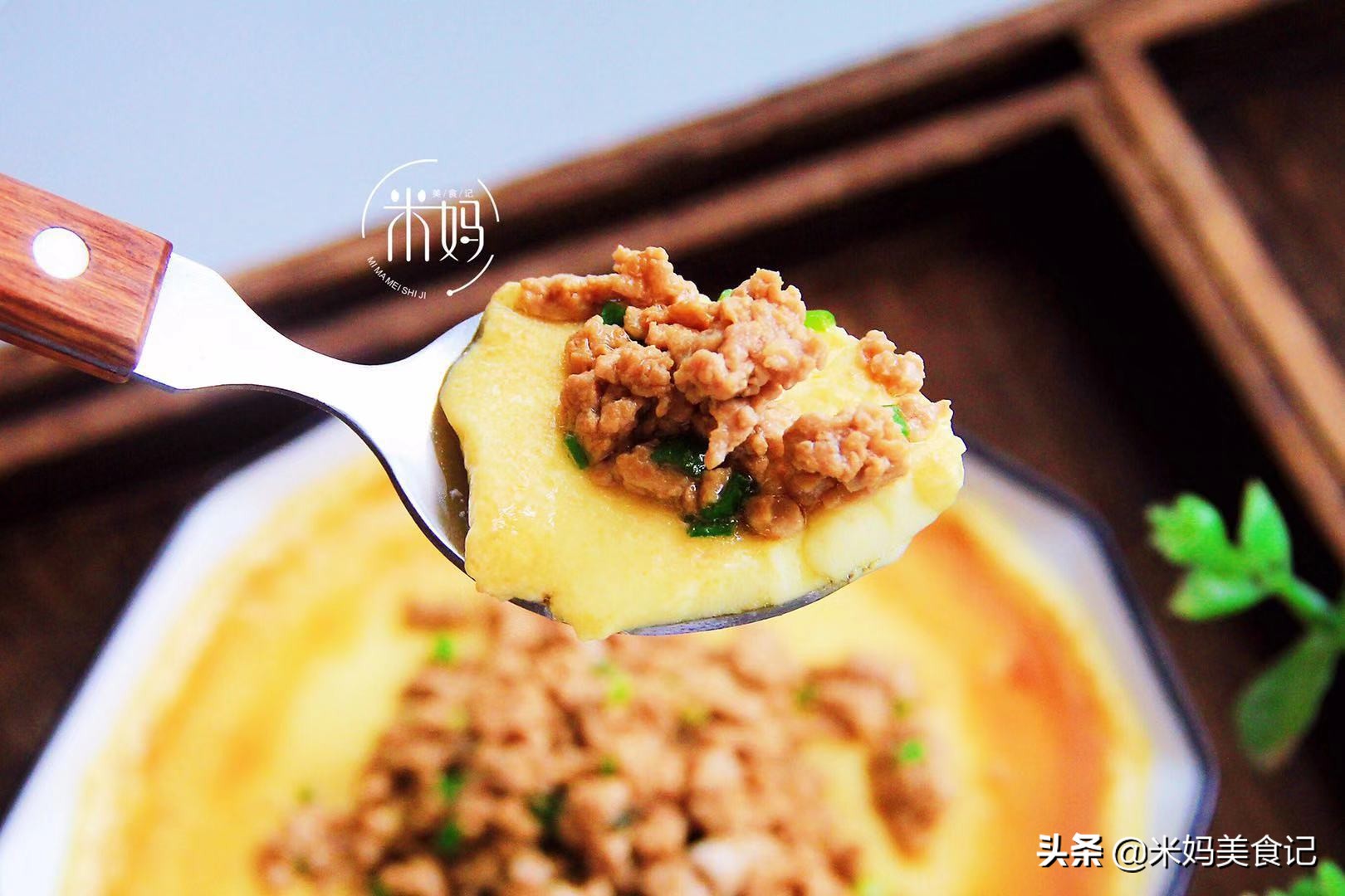 第五步:这时候鸡蛋羹也蒸好了,把猪肉末倒进鸡蛋羹上面即可!这道菜就完成了,简单的10分钟就搞定了!鸡蛋入口顺滑,肉末喷香下饭,孩子大口大口吃饭,好吃停不下来!春天,适合孩子吃的一道菜,头脑聪明体格好,每周都要做上三四次!