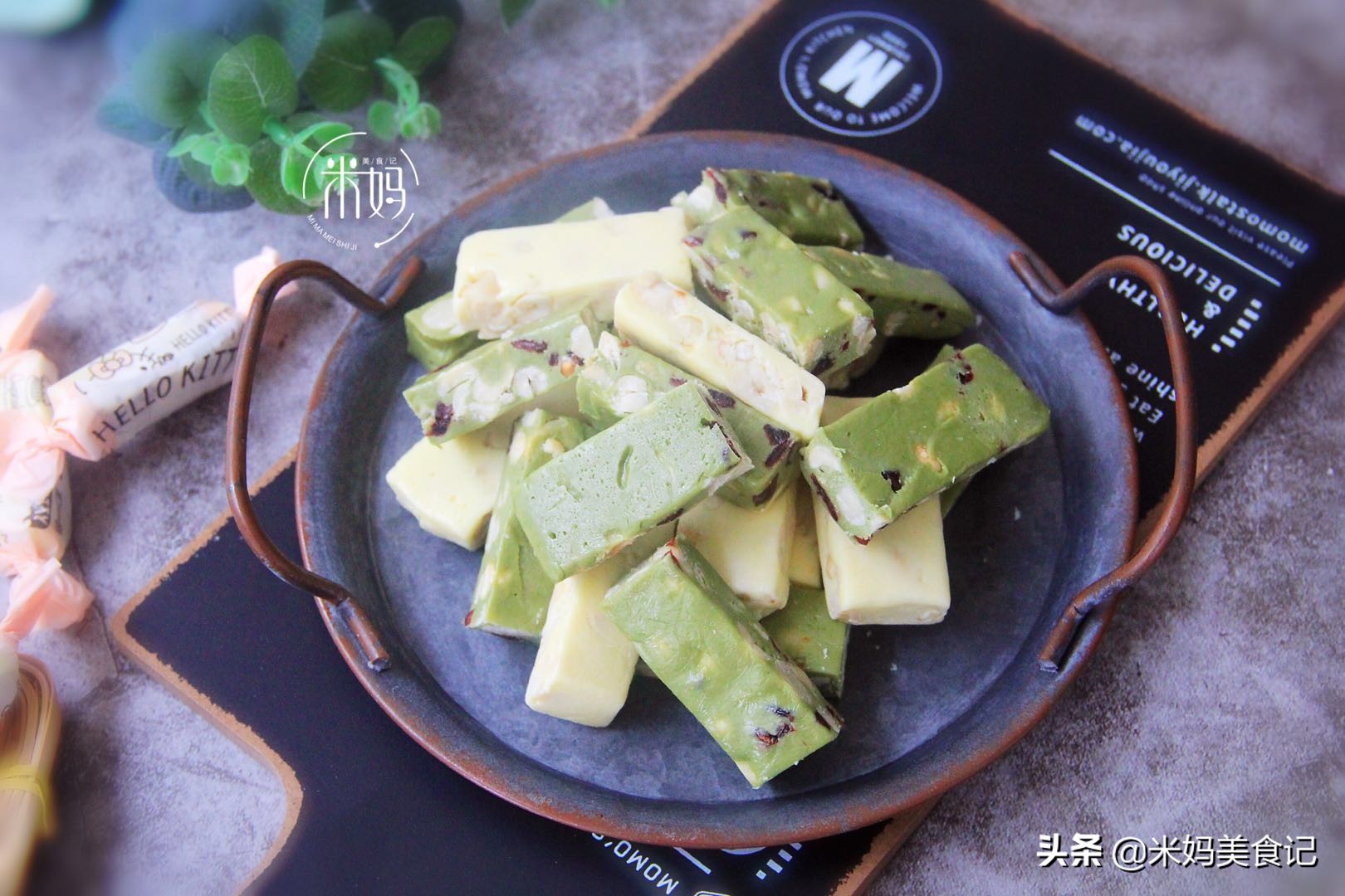 抹茶味是孩子家人的最爱,每次也必不可少,做法和以上方法一样,配方上稍微有点改变,分享给大家:抹茶蔓越莓牛轧糖食材:棉花糖 180克,无言黄油:60克,奶粉 130克,抹茶粉 10克,熟花生 100克。蔓越莓 50克;