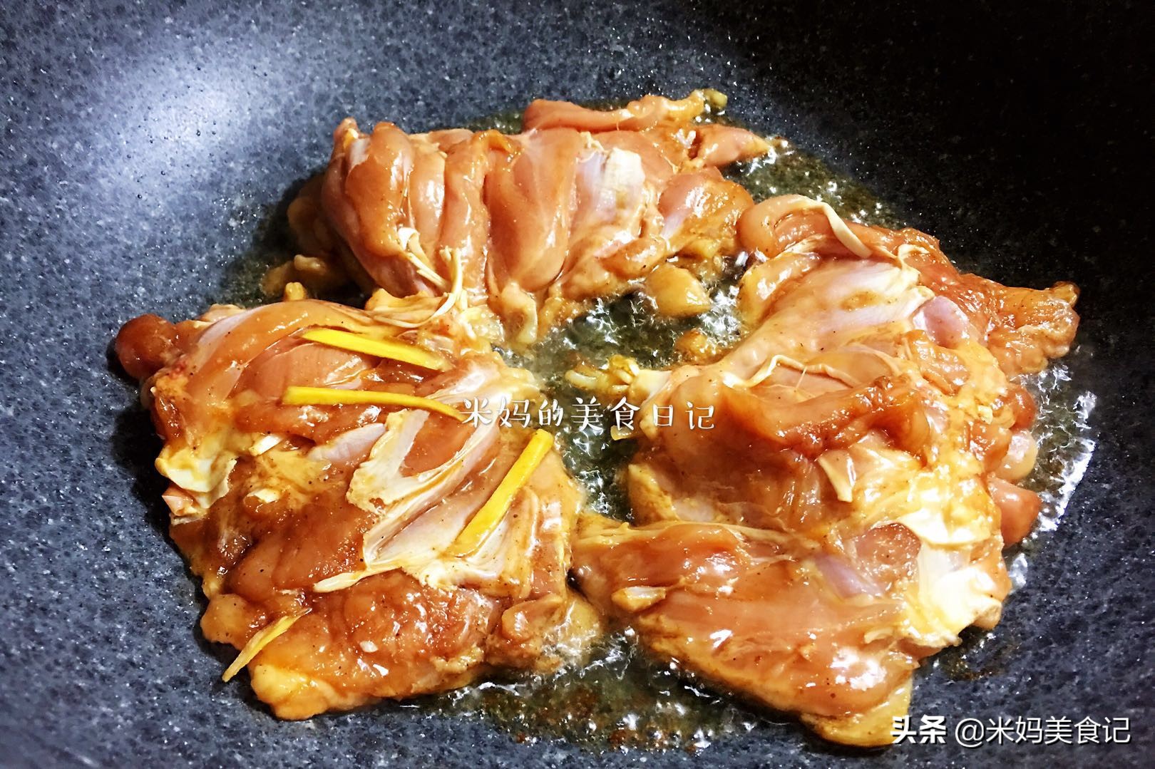 第五步:待两面全部煎至金黄后倒入酱汁翻炒均匀;用小火收汁,中间要不停的搅动,汁最好不要全收干,留一点浇到米饭上会更好吃。最后将烧好后的鸡肉取出稍凉后切成小块。