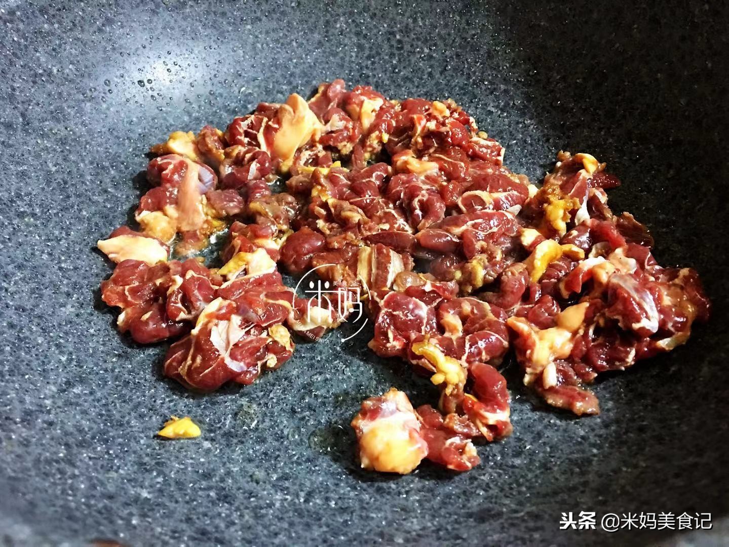 第五步:锅中再次放油,油温度7层热后,加入牛肉快速翻炒。这个全程要大火快炒至颜色变白。