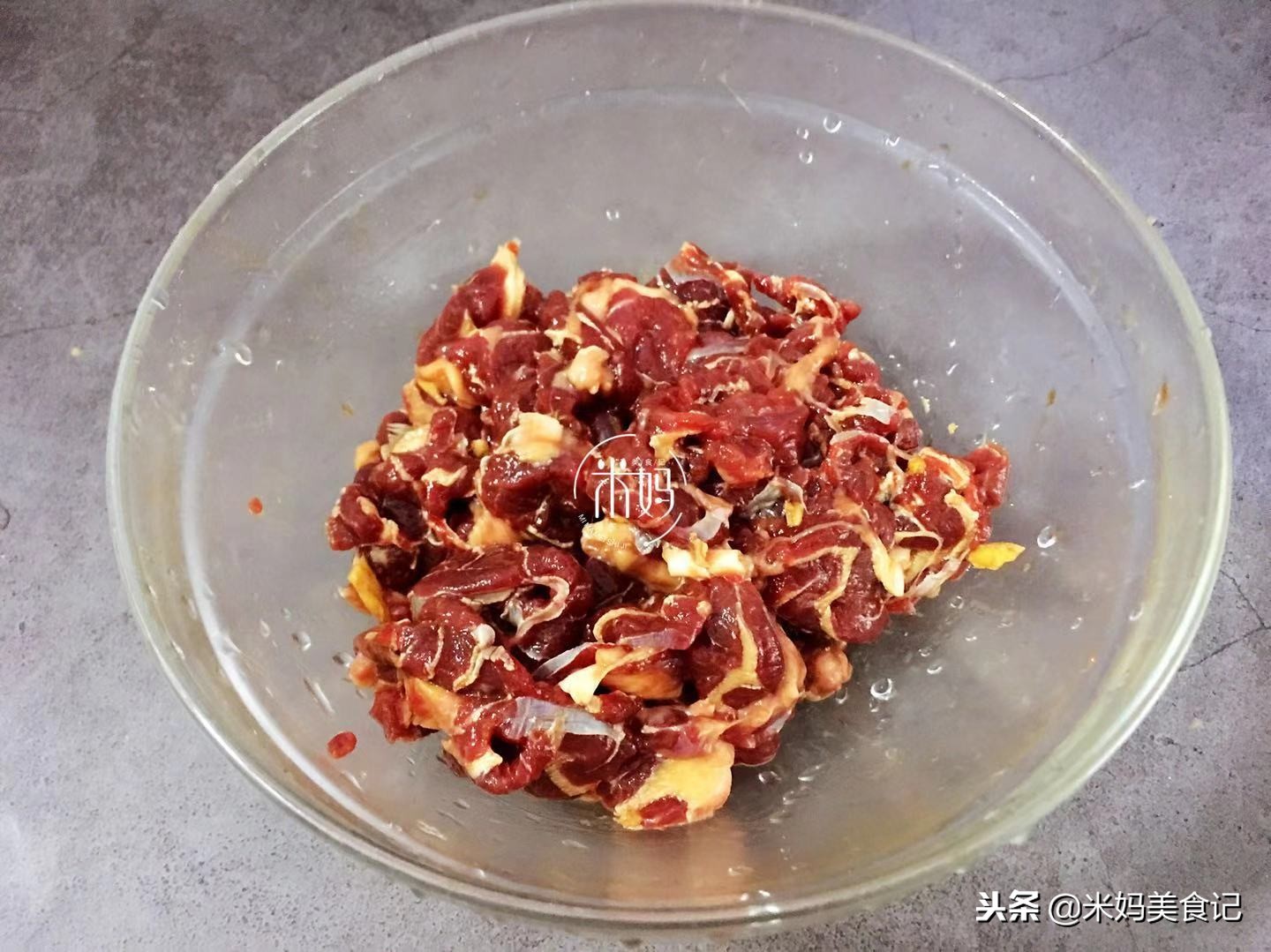 第一步:先把牛肉切片,装入碗中,再加入少许的生抽,料酒,蚝油,盐,白糖,淀粉,用手抓匀。牛肉我们家喜欢吃脆口的,所以就选择了腱子肉,你们可以根据自己的口感选择牛肉。