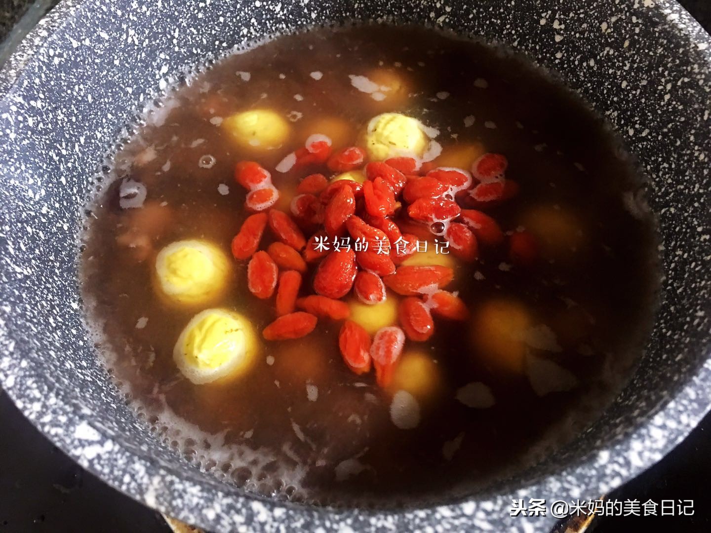 5.再加入枸杞,枸杞记得要提前泡水好哦,加入板栗和枸杞后,转小火慢慢再煲半个小时,板栗熟透即可。