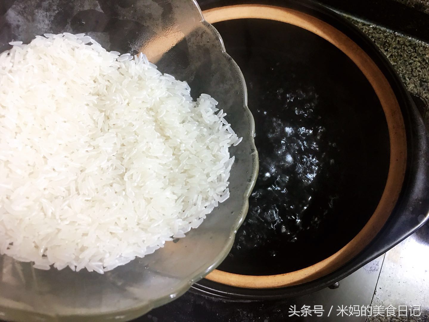 2.把大米洗干净后,用水提前泡一下。用砂锅煮一锅开水,水开后加入大米,这时候下米不仅不粘锅,还特别容易煮烂。