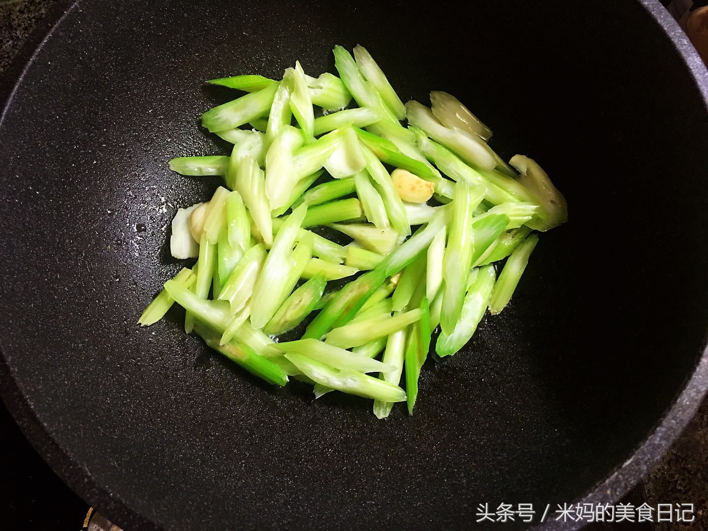 6.蒜米炒出香味后,加入西芹翻炒,再放适量的盐,大火快速翻炒均匀,炒至9成熟。