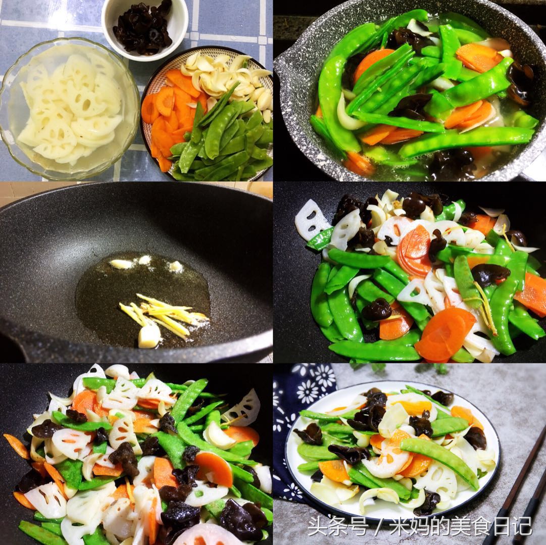 食材:莲藕,木耳,荷兰豆,胡萝卜,百合,姜丝,大蒜,盐,味精