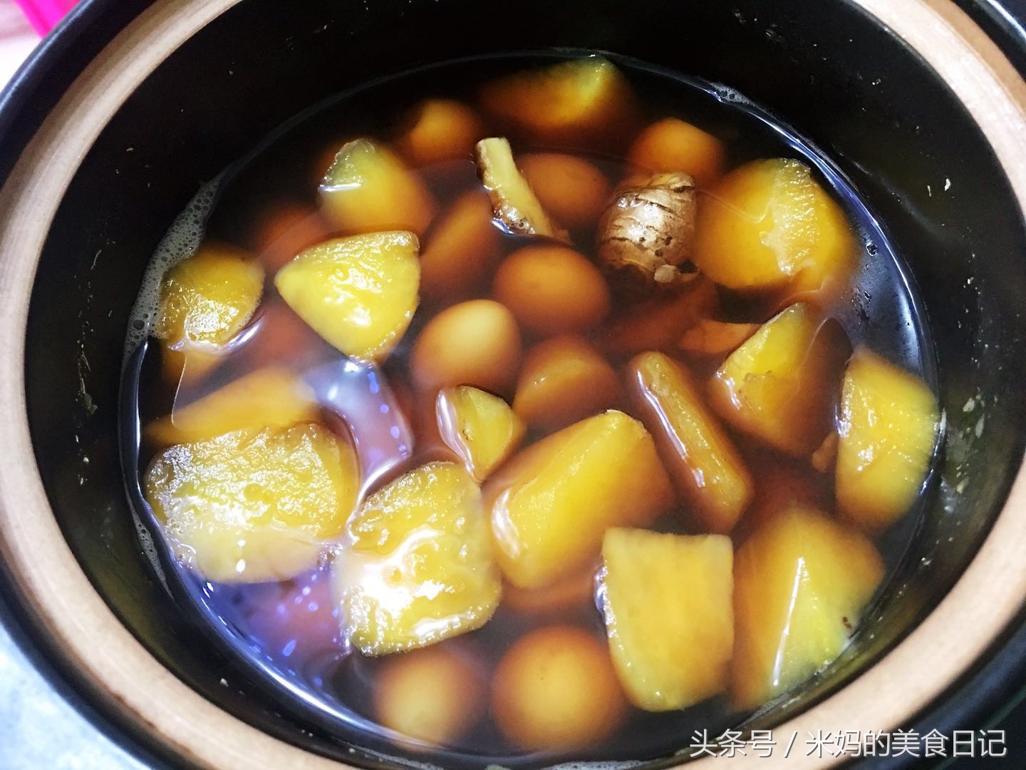 买了番薯,回到家迫不及待的做了道糖水,入秋了,天气干燥,所以整个人感觉都不好了,吃番薯糖水还能防秋燥哈!番薯它含有丰富的膳食纤维,胡萝卜素,维生素以及人体所需的钾,钙,铁磷等多种维生素和矿物质,它有减脂瘦身,通便排毒,降糖降脂,还有防衰美颜,改善肌肤状况等功效,是不是很多营养呢!这个糖水中放了老姜,红糖,鹌鹑蛋一起煮,这3种都是起到了活血,驱寒,暖胃的功效,特别是红糖,它具有益气养血,健脾暖胃,驱风散寒以及活血化瘀的功效,活血养颜,排毒养颜,润燥润肠,常喝身体好!每次煮了一大锅,全家一起喝,三两下就喝精光了!