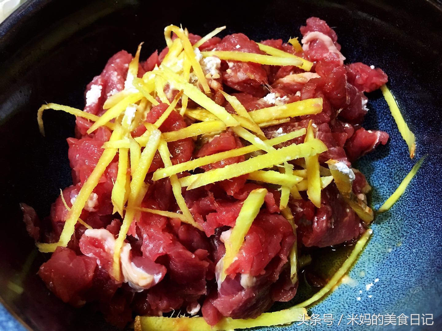 1.牛肉切片,一定要逆着纹路切哦!这样煮出的牛肉比较嫩,切好后装碗里,放姜丝,生抽,淀粉,白糖,料酒,盐,然后抓匀,可以稍微抓2分钟那样,抓匀后,再放一些油,放油的目的是可以裹住牛肉的水分,让它不流失,再次抓匀,腌制15分钟。这样炒出的牛肉又香又嫩又好吃,如果想要颜色更漂亮,可以放点老抽一起腌制。