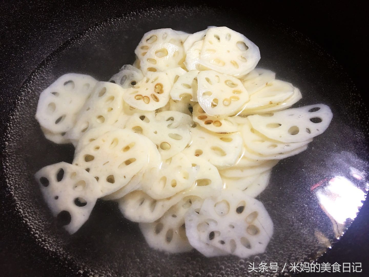 4.锅中水煮开,水开后放藕片进去煮2分钟左右,不要煮太久,否则就不脆了,莲藕是可以生吃的,所以不要担心这样不熟吃不了哈!
