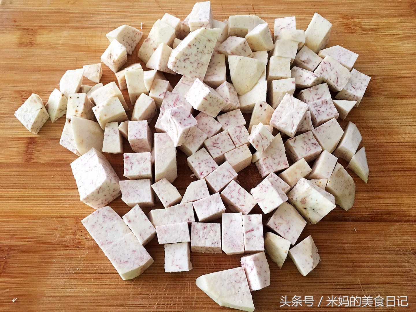 3.现在我们来来处理一下芋头,芋头要挑选是荔浦芋头哦!这个是芋头里边最好吃的一个品种。然后把芋头切丁。