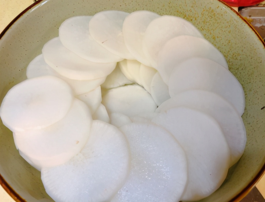 制作过程:第一步,白萝卜削皮,清洗干净,切去两头,将其切成片,差不多2毫米厚便可,薄厚尽量要均匀,准备一个盘子,将切好的白萝卜片码放盘子中;