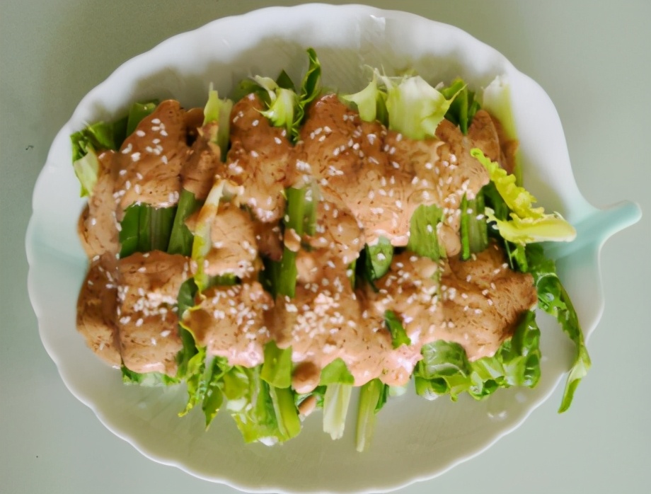 第五步,将油麦菜切成长段,码放在盘子中,淋入调好的芝麻酱,再撒上少许熟芝麻,这道菜就做好了,上桌。