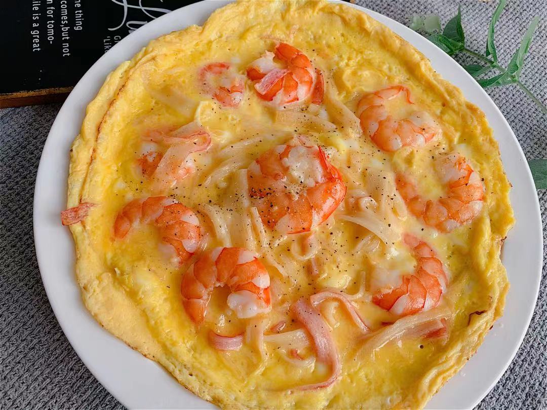 食材:蟹柳5根、鸡蛋3个、虾适量、牛奶20克、盐、黑胡椒适量