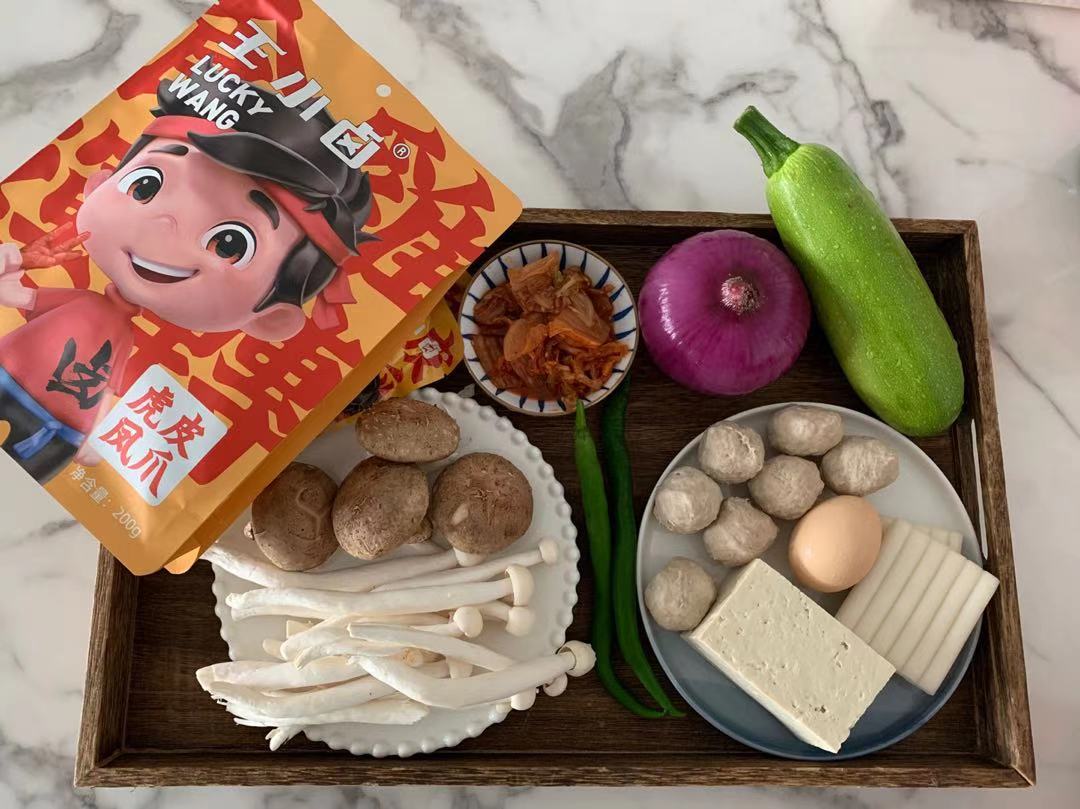 食材:王小卤虎皮凤爪、贡丸、香菇、白玉菇、洋葱、西葫芦、泡菜、年糕、老豆腐、杭椒