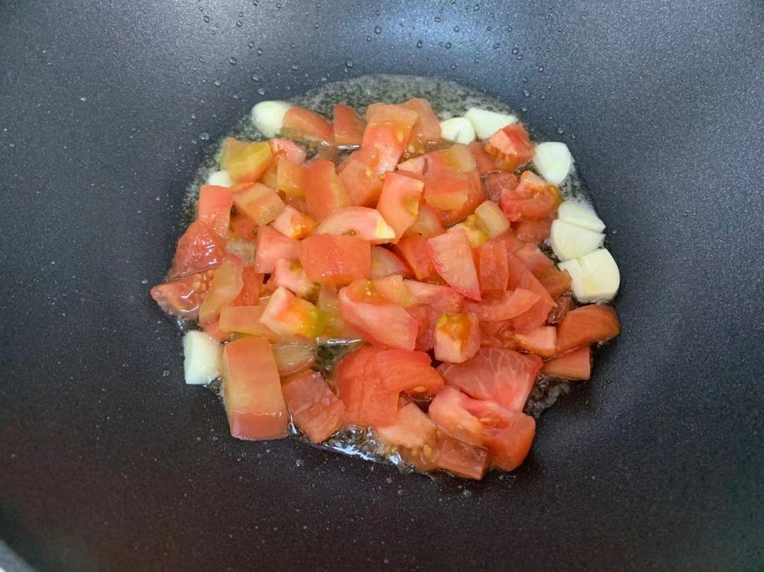 ️3、利用剩下的油炒香蒜片+番茄炒出汁。
