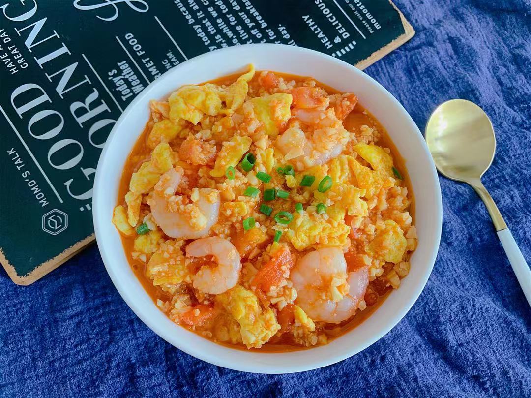 食材:鸡蛋、番茄、花菜、虾仁、葱花、煎炒小油滴
