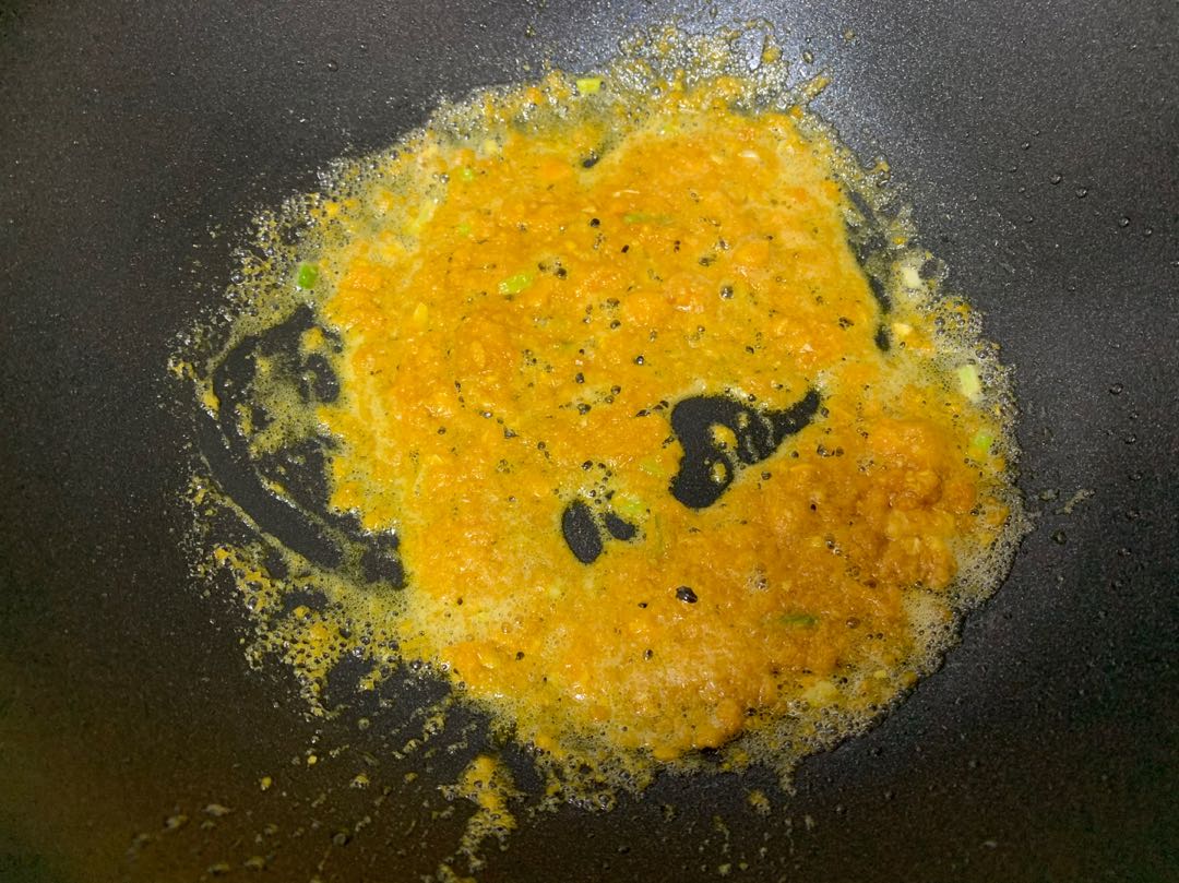 5、加入热水煮开,南瓜泥,豆腐,青豆煮3-5分钟。