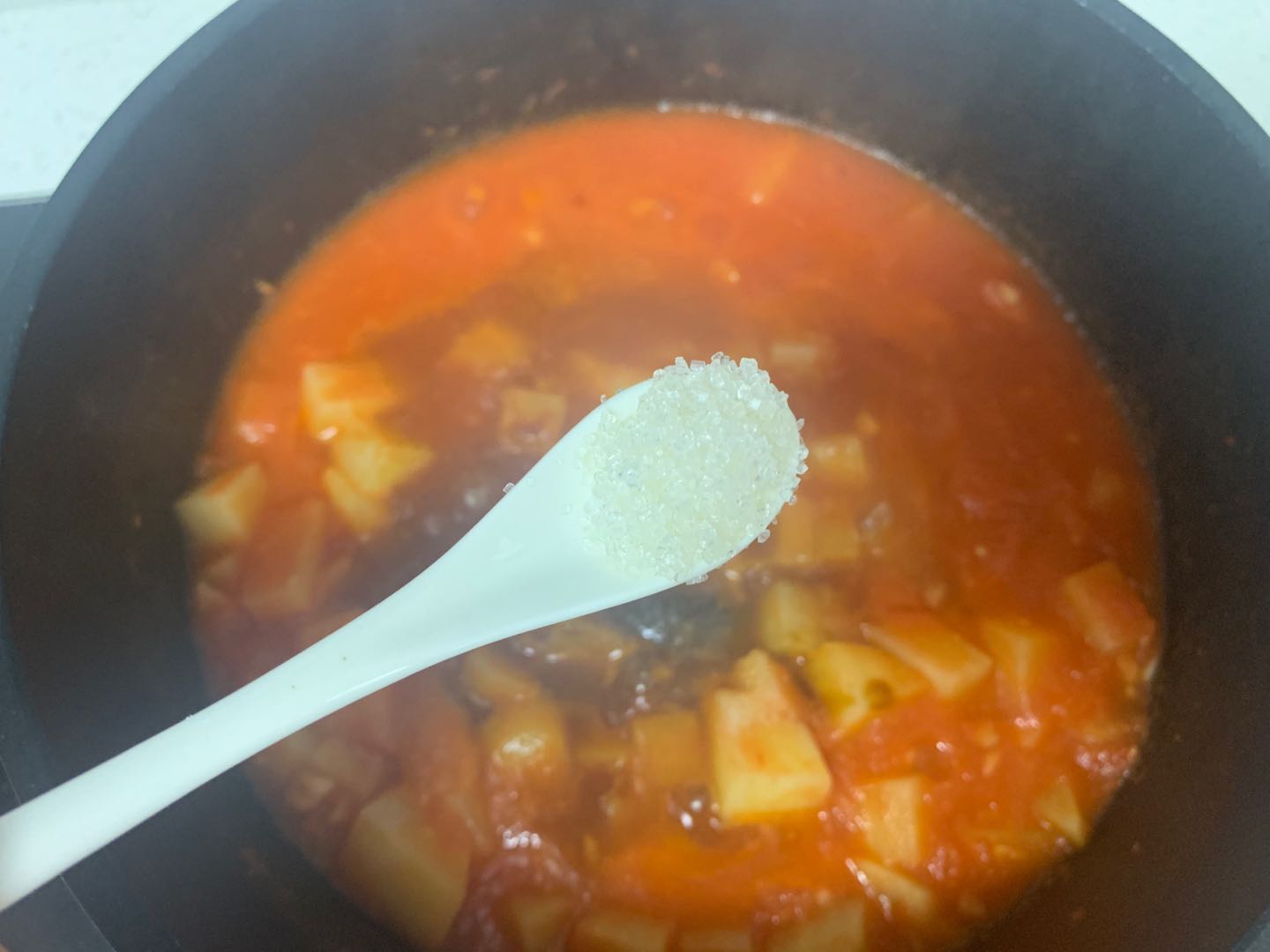 7、土豆变软后加入1勺生抽,1勺蚝油,1勺白糖,少许盐调味。
