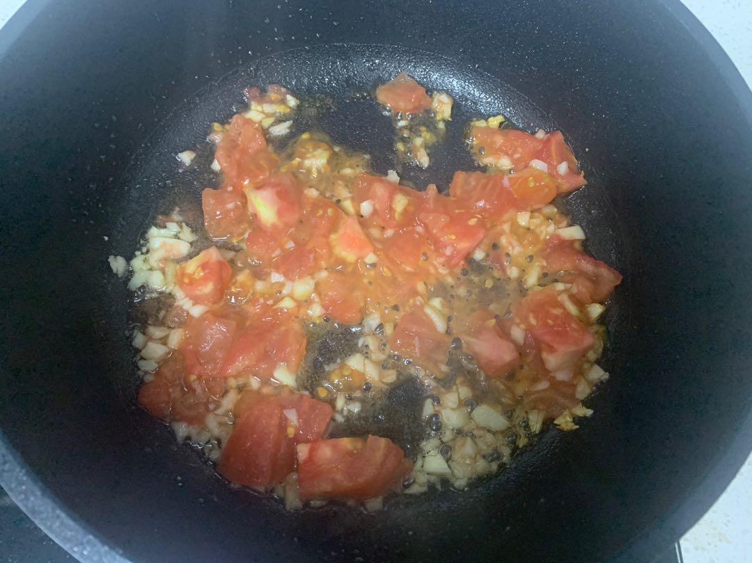 4、锅中放少许油,放入蒜末爆香,加入番茄炒软。