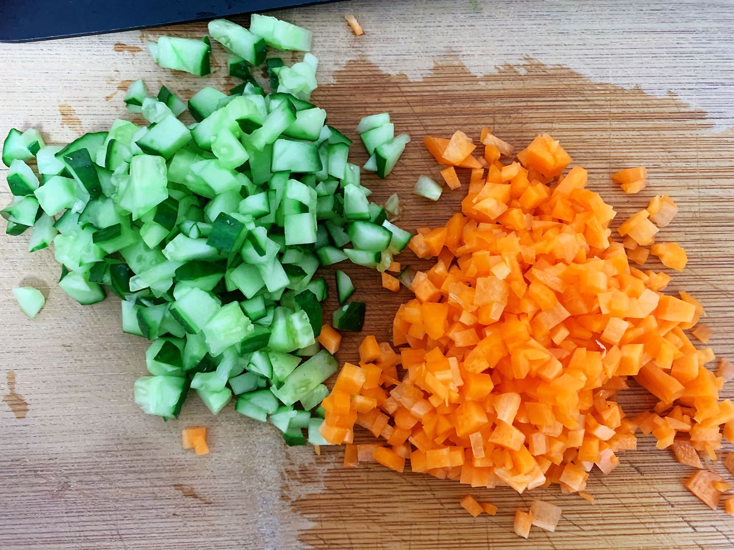 5、加入玉米、黄瓜、胡萝卜翻炒变色。
