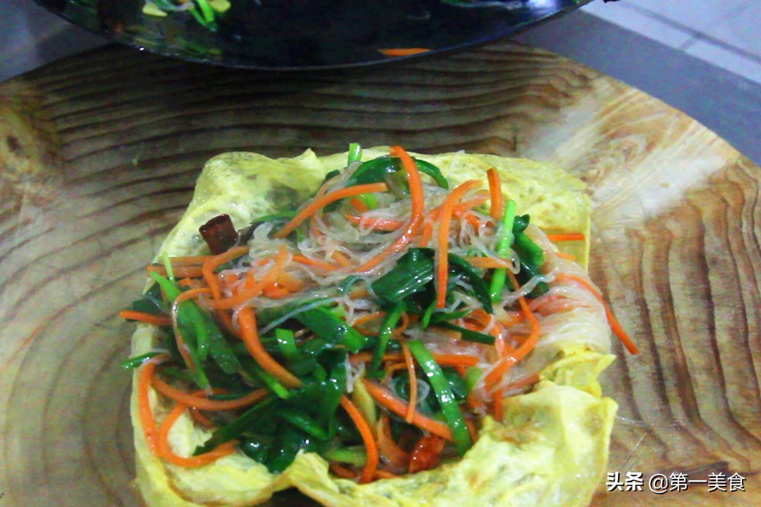 6.锅内再烧油,放入葱姜、干辣椒爆香,倒入粉丝、胡萝卜、韭菜,转大火快速翻匀,然后加入食盐、鸡粉、生抽、胡椒粉调味,翻匀后即可出锅。
