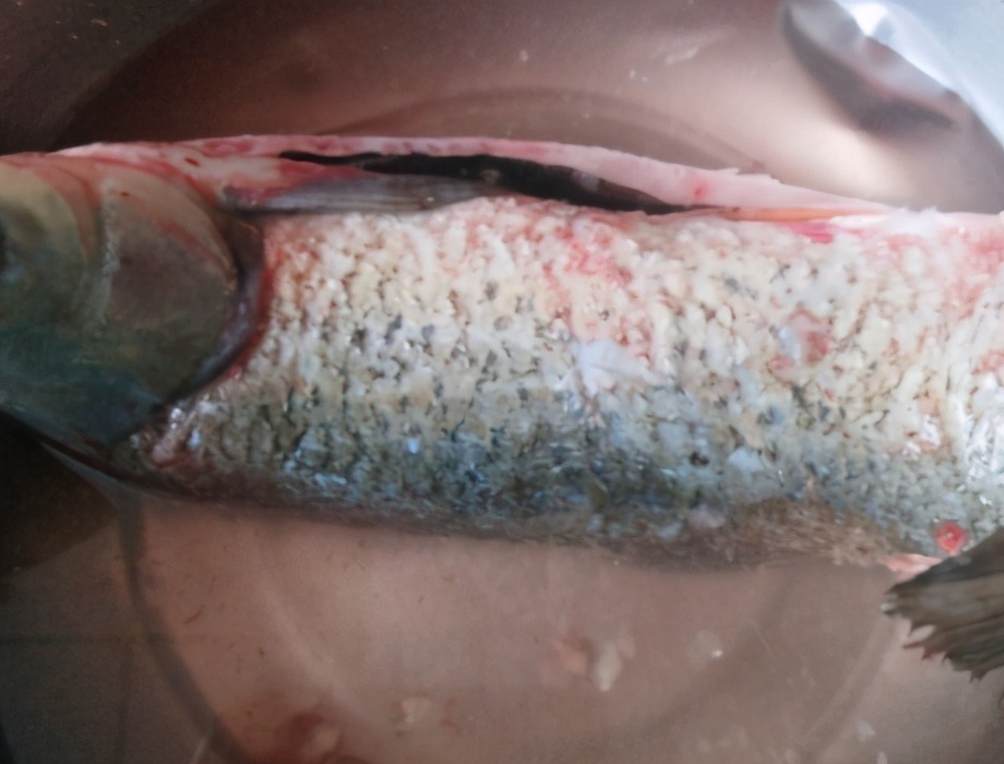 制作过程:第一步,草鱼一条,事先将其刮掉鱼鳞,从草鱼的背部最厚的地方剖开,去除内脏、鱼鳃以及其他不能吃的部分,草鱼肚子里的黑膜记得去除干净;